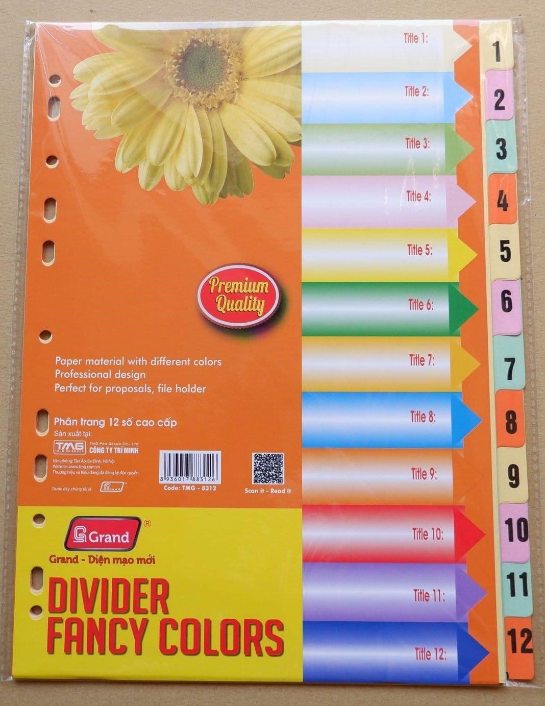 Cách sử dụng: Sử dụng dễ dàng, 12 bìa với các con số được sắp xếp theo thứ tự trước sau, các lỗ ở mép bìa mục đích để móc vào các còng sắt của các bìa còng, bìa còng cua, bìa còng nhẫn, bìa accor…